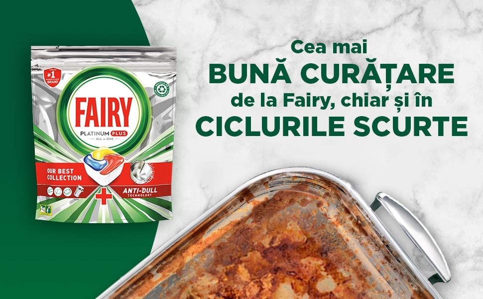 Capsulele pentru mașina de spălat vase Fairy Platinum Plus oferă o curăţare ca nouă, precum și cea mai bună colecție de curăţare a alimentelor dificile Fairy, ajutând chiar și la eliminarea aspectului lipsit de strălucire acumulat de alungul timpului, pentru a reda strălucirea originală a vaselor. Fairy Platinum Plus vă oferă o curățare remarcabilă, îndepărtând petele dificile de alimente, chiar și în condițiile unui test de curățare dintr-un ciclu scurt. Deci, dacă nu aveți timp, nu e nici o problemă. Schimbați la ciclul scurt. Fairy combină detergentul lichid cu cel pudră într-o singură capsulă puternică. Invelișul său ultra solubil se dizolvă repede, astfel încât începe curățarea rapid pentru a-și face treaba. Și sunt atât de ușor de folosit! Nu este nevoie de despachetare, așează-le doar în dozatorul de detergent al mașinii de spălat vase. Treci la ciclul scurt* și economisește timp, energie și apă, comparativ cu un ciclu standard obișnuit!