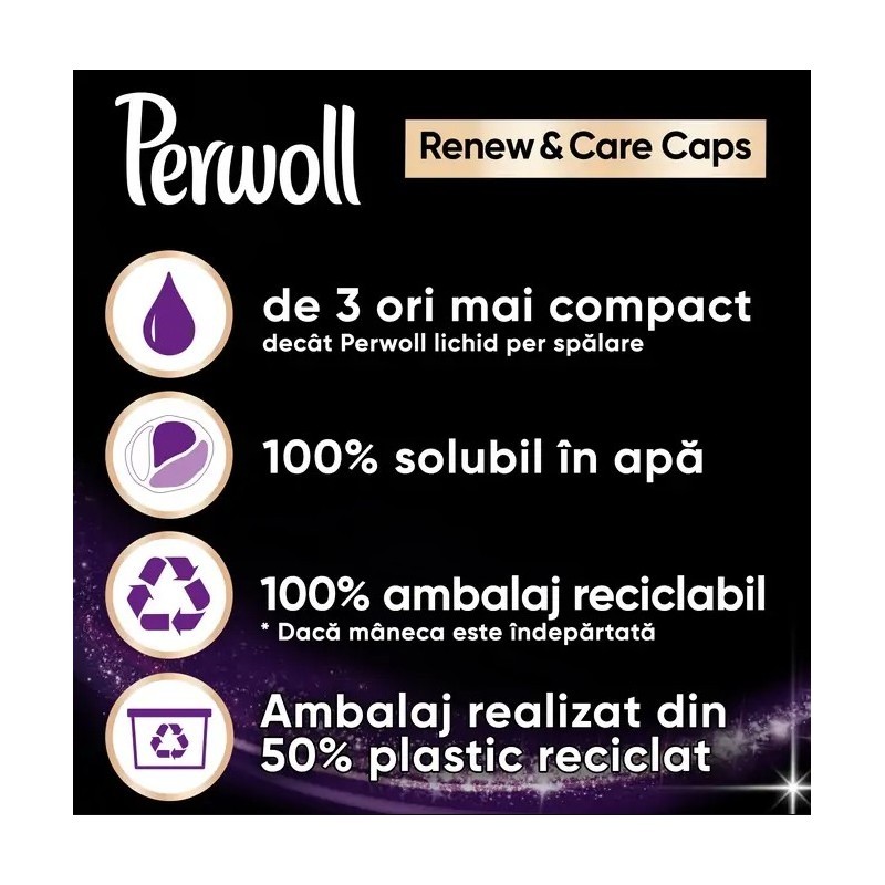 Detergentul capsule Perwoll Renew Black este solutia potrivita pentru curatarea si ingrijirea hainelor negre si a culorilor inchise. Capsula noastra cu 3 camere contine o formula de ingrijire ce reda intensitatea culorilor si netezeste fibrele aspre, pentru ca hainele sa ramana ca noi pentru mai mult timp. Detergentul curata intr-un mod delicat hainele negre/inchise la culoare, protejand tesatura, atat in apa calda, cat si in apa rece.